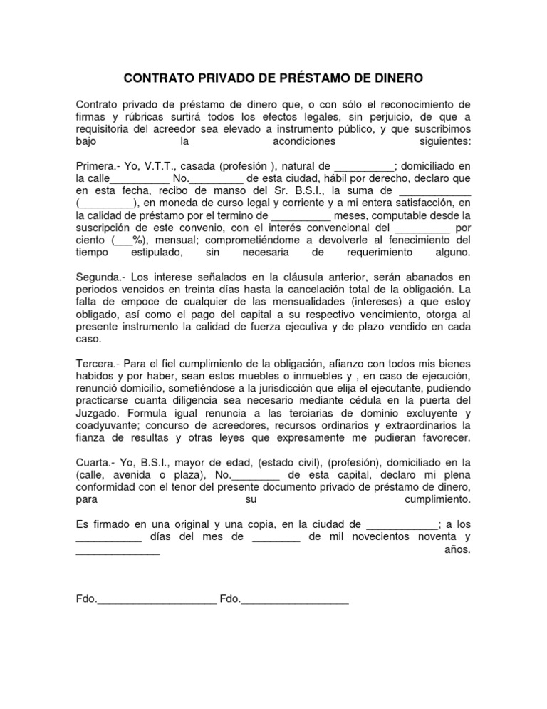 De requerirse, se pueden a adir cl usulas a manera de soporte. CONTRATO DE PR STAMO DE DINERO CON INTERESES ntegro del presente contrato. En modelos y contratos gratis ya hemos visto un modelo de contrato de comodato (pr stamo gratuito). Deja claro cu l es el plazo en el que te tienen que devolver el dinero y cu les son los intereses. Contrato de Pr stamo de Dinero Entre Particulares Este documento denominado contrato de pr stamo de dinero entre particulares o contrato de mutuo, es un contrato que comprende una transacci n por la cual una o varias personas (llamadas prestamistas) ofrecen una cantidad determinada de dinero a otra u otras (llamadas prestatarios) siempre con la obligaci n de que sta ltima lo reembolse a la primera m s adelante, en un plazo.