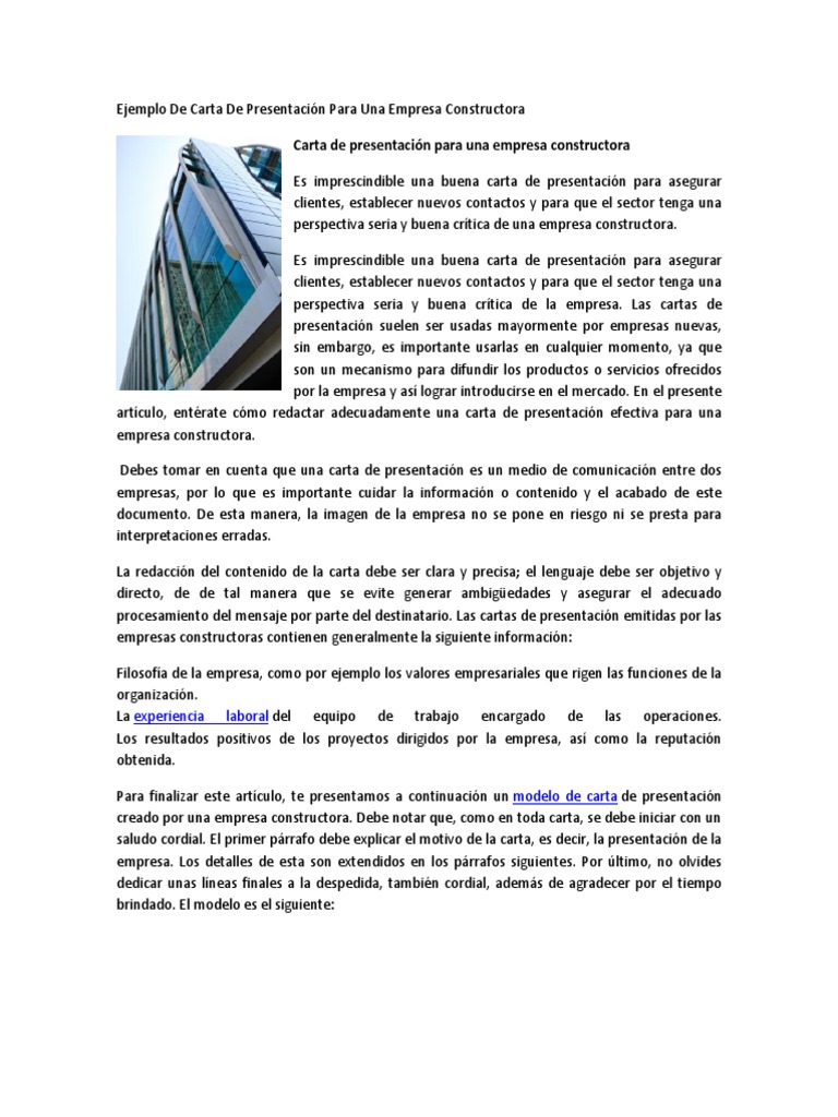 Ejemplos de carta de presentaci n de una empresa Una carta de presentaci n de una empresa, es una herramienta de vital importancia ya que permite m s conexiones con los clientes y posibles clientes que est n interesados en sus servicios. En muchas ocasiones, las empresas necesitan darse a conocer unas a otras para ofrecer sus servicios y actividades de manera que puedan salir beneficiadas ambas.