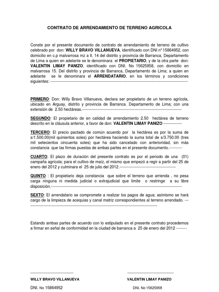 Arrendamiento Arrendamiento de tierras agrcolas Un contrato de arrendamiento no existe nunca de forma aislada. MODELO DE CONTRATO DE ARRENDAMIENTO ARTURO FERNNDEZ VENTOSILLA me parece que lo consignado en parrafa cuarto de la clausula decima expresa en el modelo de contrato de arrendamiento, pudiera tener concordancia con el refglamento del d.leg. Por virtud de este contrato nombre completo del arrendador).da en arrendamiento a nombre completo del arrendatario) el predio al que se refiere el inciso b) de la declaracin de este documento y el arrendatario lo recibe en este concepto. N 117 referido expresamente al arrendamiento para vivienda.